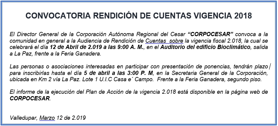 La Corporación Autónoma Regional del Cesar a través de esta Audiencia Pública expone de forma clara a los ciudadanos y ciudadanas los resultados de la gestión de la institución, con el fin de garantizar el ejercicio del control social, generar condiciones de confianza y contribuir a las prácticas de participación ciudadana en el manejo de los recursos públicos.